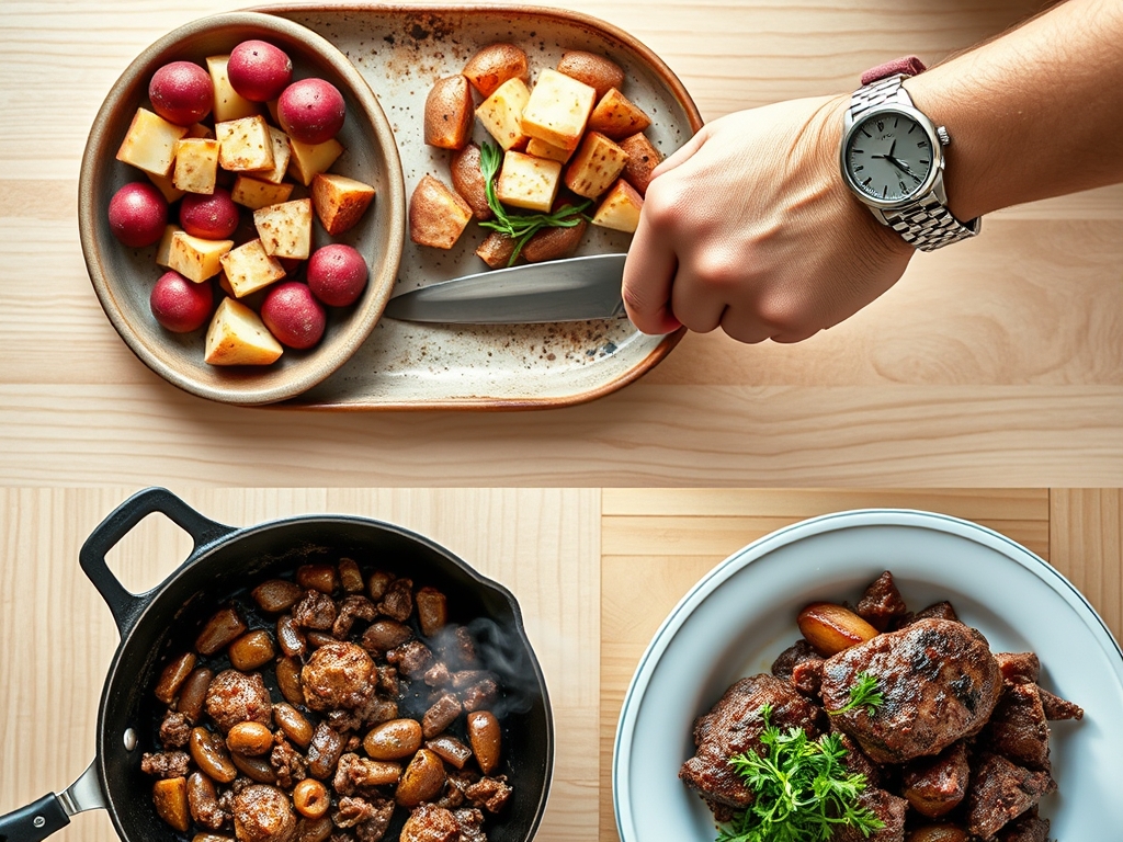 The flow begins with the potatoes. While they par-boil or sear, you are dicing your aromatics. Never wait for one ingredient to finish before prepping the next. By the time the beef is ready to be deglazed, your herbs should already be minced and ready to infuse. This staggered approach ensures that the garlic never burns while the potatoes are still raw in the middle.